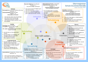 Dieser Satz lässt sich auf vielfältigste Arten ergänzen. Wer ist an der Schule wofür zuständig, an wen kann ich mich wenden? Wie kann ich jemanden kontaktieren? Um einige dieser Fragen zu beantworten, haben wir einen Elternwegweiser zusammengestellt, der Eltern, aber auch Schülerinnen und Schülern, helfen soll, sich im System der Schule Grumbrechtstraße zurechtzufinden.
