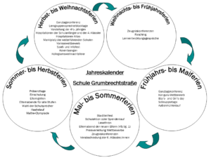 Das Schulleben an der Schule Grumbrechtstraße ist bunt und lebhaft. Um nicht die Übersicht zu verlieren oder etwas zu verpassen, bietet der „ewige“ Jahreskalender eine Übersicht über alle wiederkehrenden Ereignisse an der Schule Grumbrechtstraße. Hier können Sie sehen, wann wir zum Herbstmarkt einladen, oder in welchem Zeitraum die Elterngespräche stattfinden werden und vieles mehr.