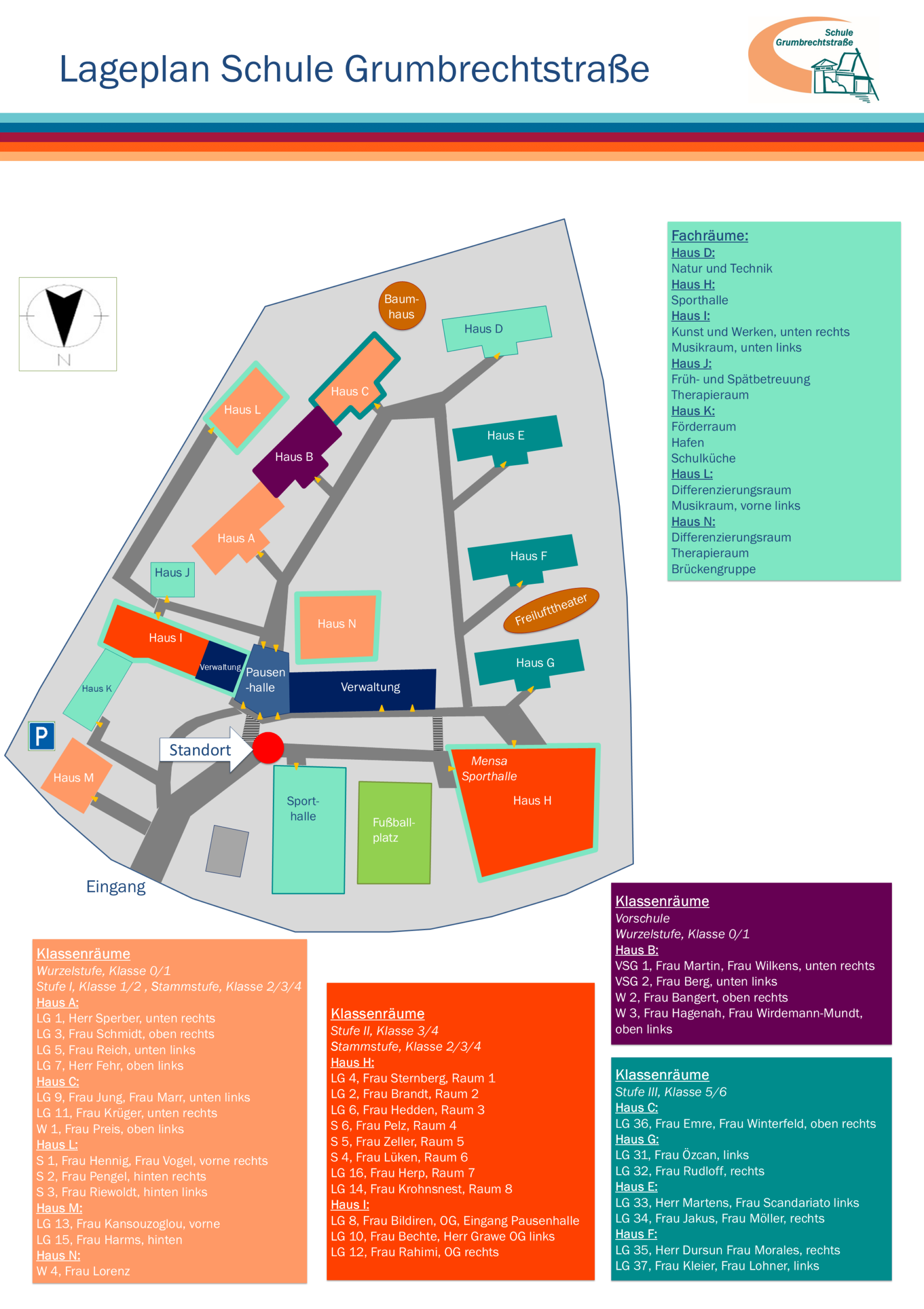 Lageplan Wo finde ich die Lerngruppen der Stufe II? Wer ist die Klassenleitung der Lerngruppe W 1? Wo ist die Mensa oder das Haus D? Die Antworten auf diese und weitere Fragen zu unserem Schulgelände finden Sie auf dem nachfolgenden Lageplan. Lageplan Juni 2025 Gru_Lageplan_Juni_2025