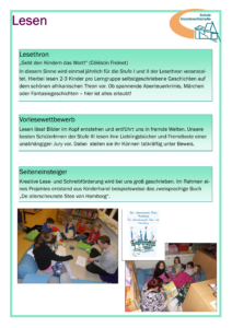 An der Schule Grumbrechtstraße wird das Lesen seit jeher groß geschrieben. Aus diesem Grunde rufen wir jährlich vielfältige Veranstaltungen und Aktionen zu diesem Thema ins Leben, um so die Fähigkeiten der Kinder auf abwechslungsreiche Weise zu entfalten.