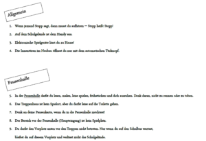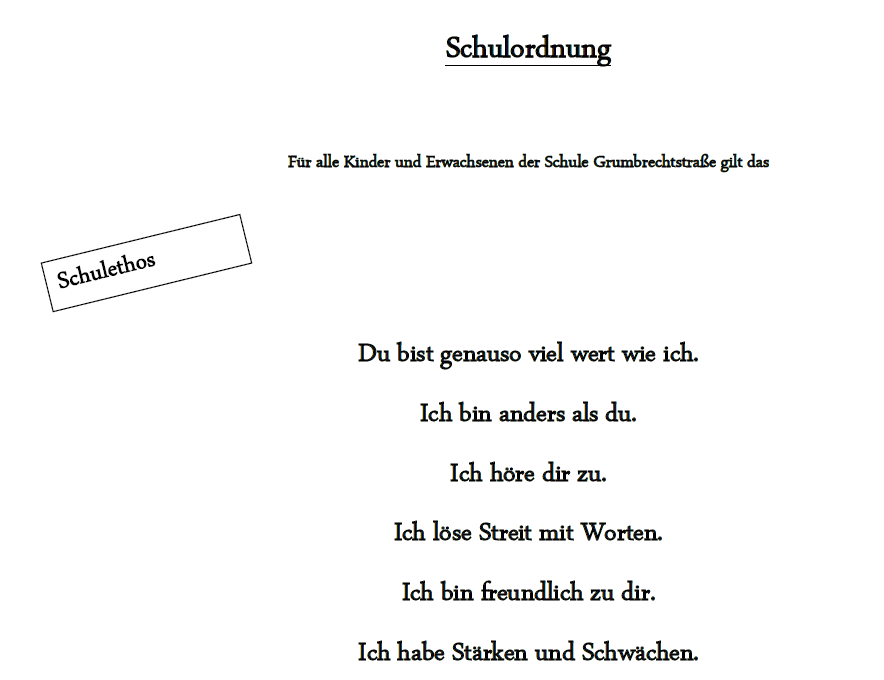 Für unser Zusammenleben an der Schule Grumbrechtstraße haben wir eine Schulordnung entwickelt, die den Umgang mit allen an Schule beteiligten Personen – Kollegium, Schülerschaft, Elternschaft – untereinander regelt. Die Schulordnung der Schule Grumbrechtstraße bietet dadurch eine Grundlage für ein friedliches Miteinander und regelt Rechte und Pflichten aller Beteiligten. Sie gibt uns ein Gerüst, welches uns daran erinnert, alle Mitmenschen so zu behandeln, wie man selbst behandelt werden möchte.